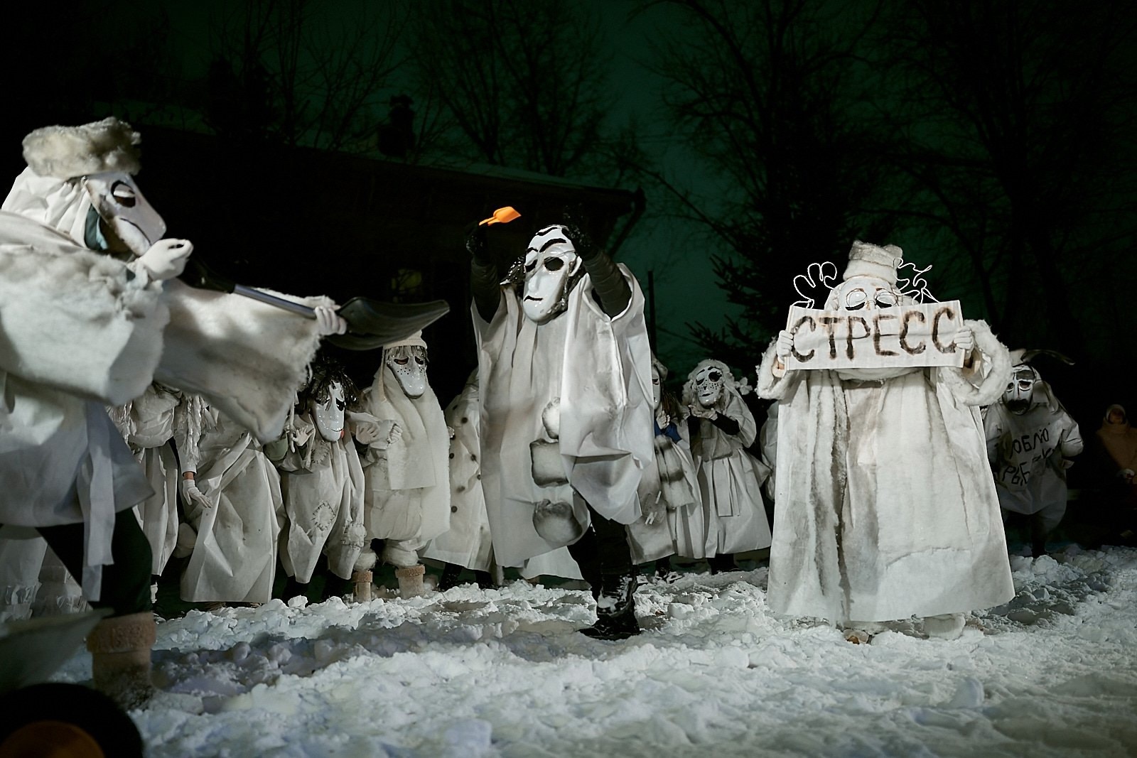 Движение сюжета – это движение душ зрителей от мрачных и тяжелых мыслей к светлым и легким. Помогает изобразить это движение сгущающиеся сумерки во время спектакля. Томский временной переход с 17:00 и 18:00, во время которого длится действие перфоманса, делает белые костюмы и маски актеров более яркими и белыми на фоне наступающих сумерек, переходящих в вечернюю тьму. Белеют костюмы и маски актеров – светлее и легче становятся мысли зрителей. Не только светлее, но ярче в сгущающихся ночных сумерках делается островок пространства, освещаемый уличными фонарями и новогодними гирляндами. Пространство меняется – это ли не одна из главных задач уличного театра, которая была достигнута постановкой...? Преображается постановкой и фасад здания Дома искусств – он теряет свойства стены, которая ограничивает пространство, становясь знаком вертикальной устремленности. Разве это не о преодолении земного притяжения, источником которого являются наши будничные тревоги и переживания..?